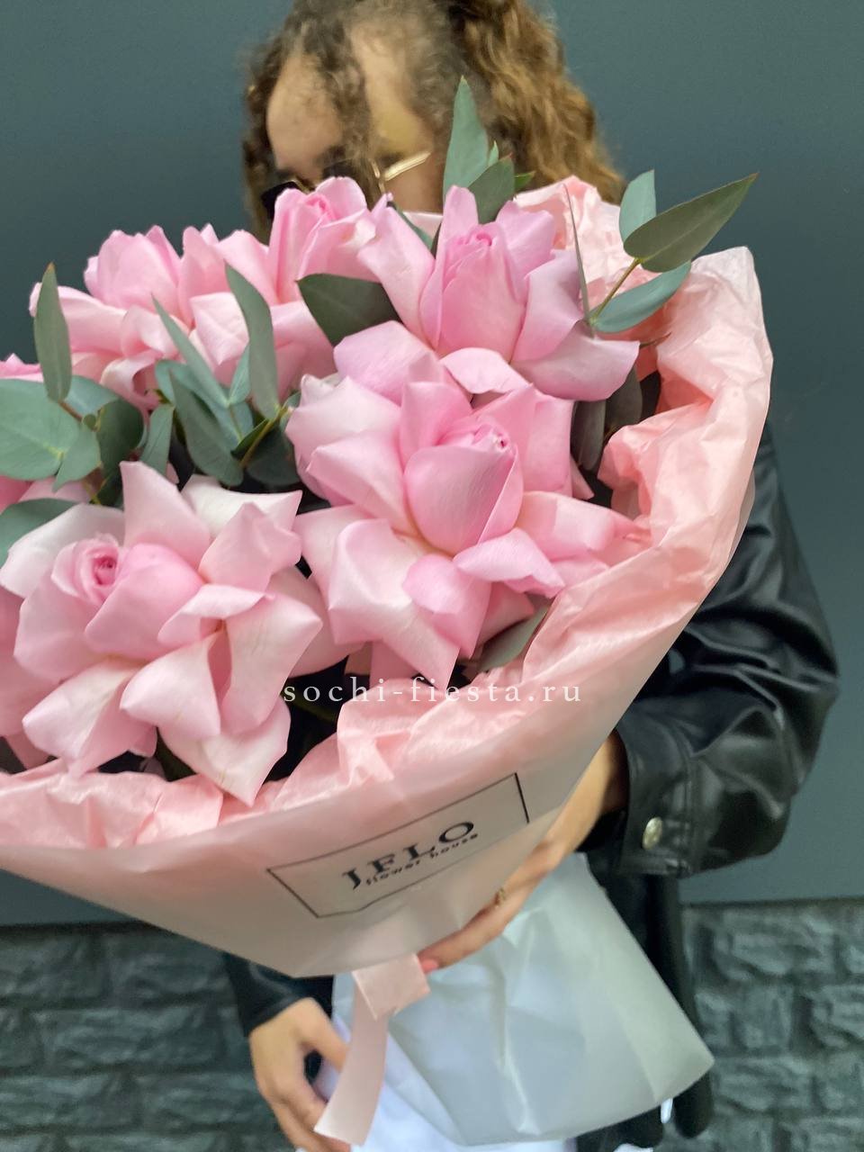 Семь вывернутых роз образуют компактную группу с чистым силуэтом. Ветки эвкалипта задают вертикальный ритм и добавляют воздуха между бутонами. Букет держит форму и выглядит собранно.