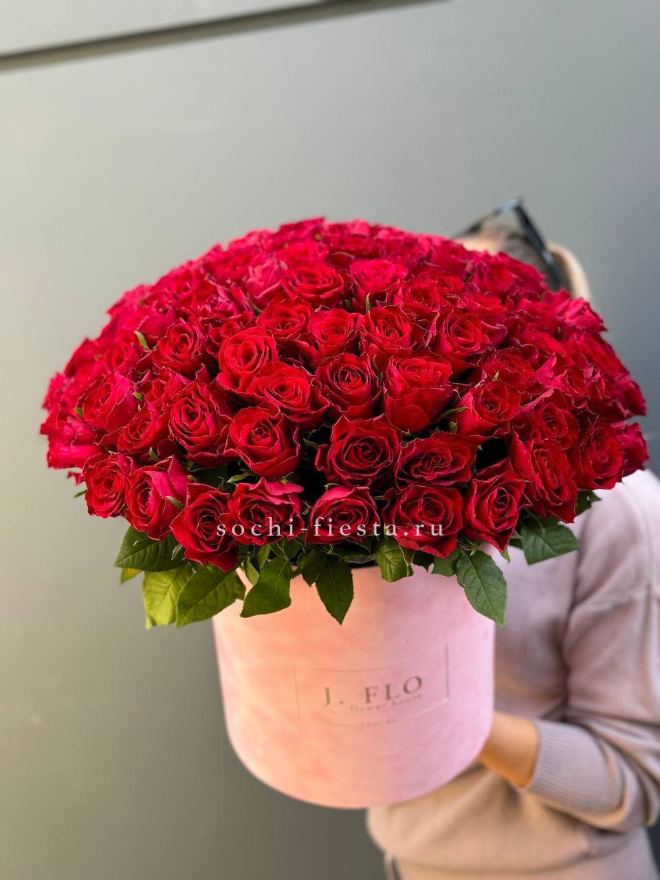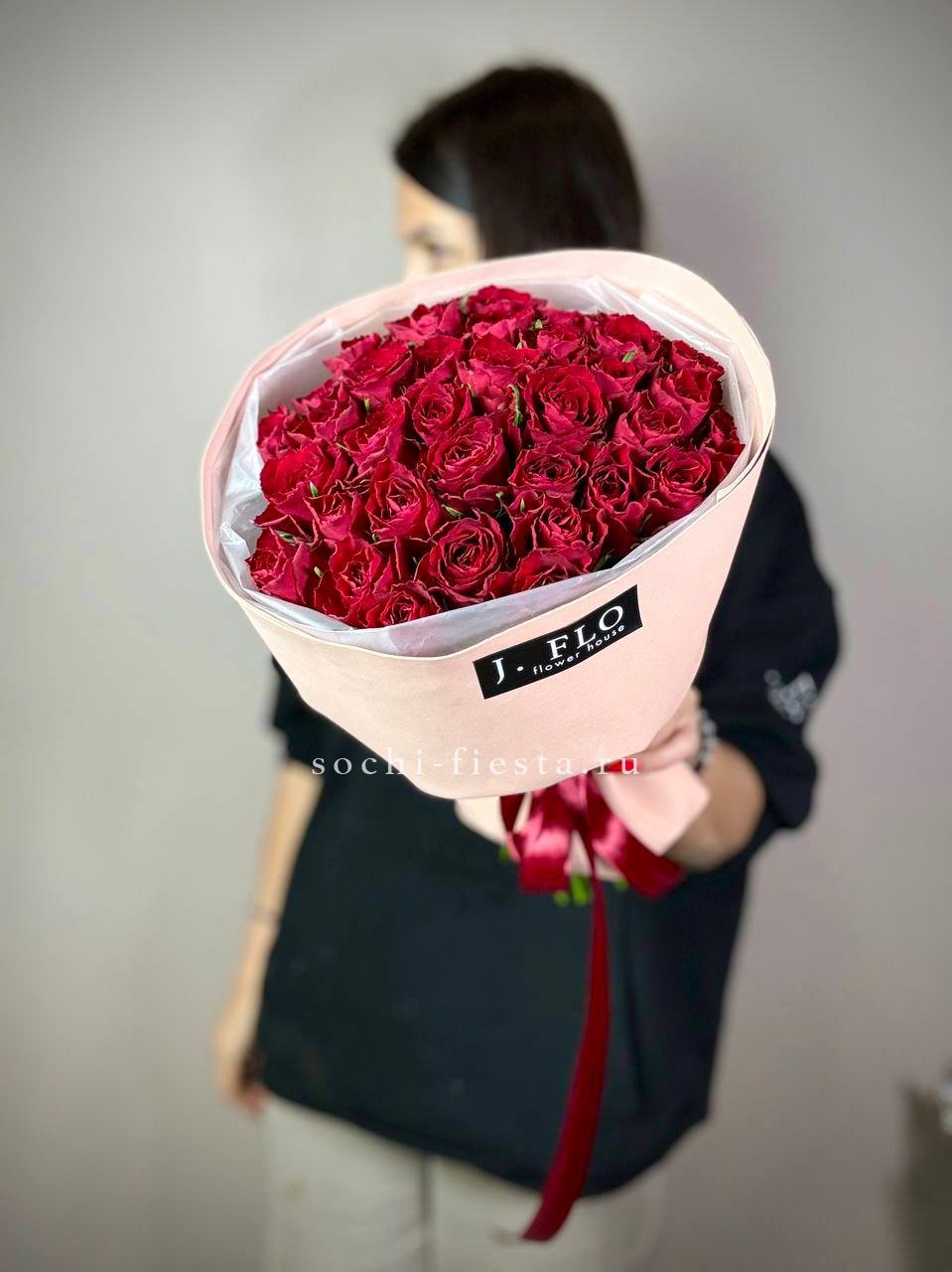 Пятьдесят пять роз собраны в плотную округлую форму с чёткими линиями и уверенным силуэтом. Букет держит структуру и создаёт ощущение завершённости.