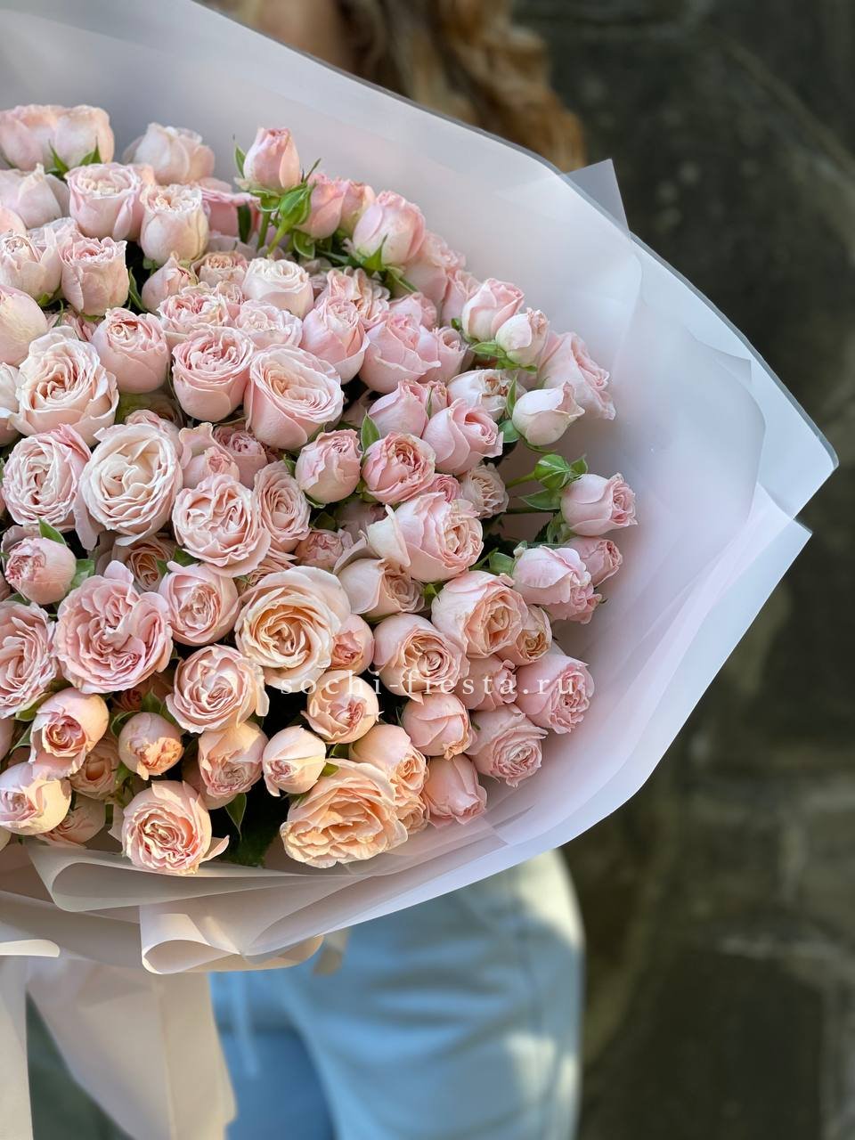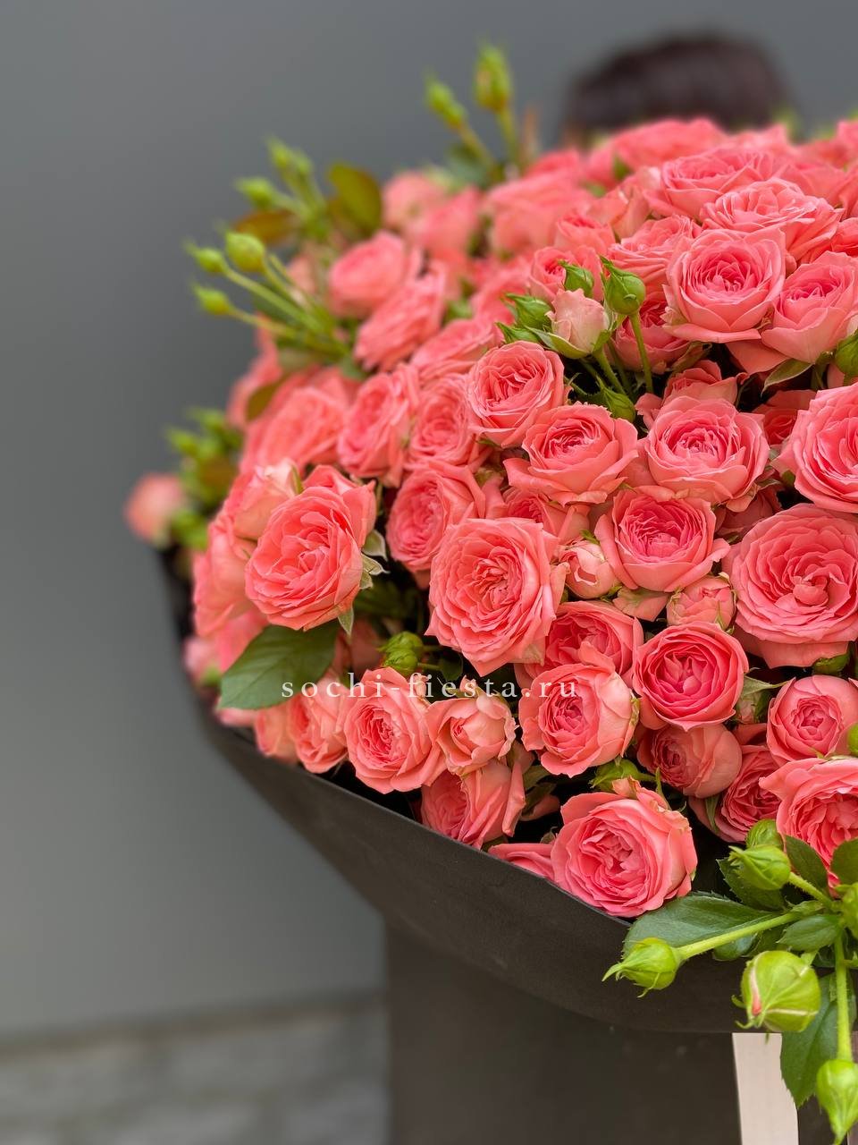 Сто одна кустовая роза Барбадос создаёт впечатляющий объём и визуальную мощь. Множество бутонов формируют плотную структуру с выразительным силуэтом. Композиция наполняет пространство и приковывает взгляд.
