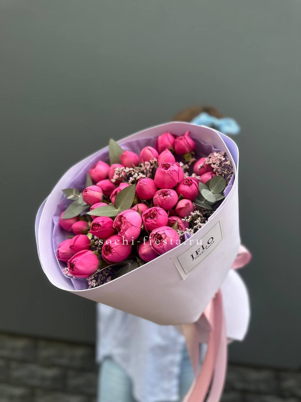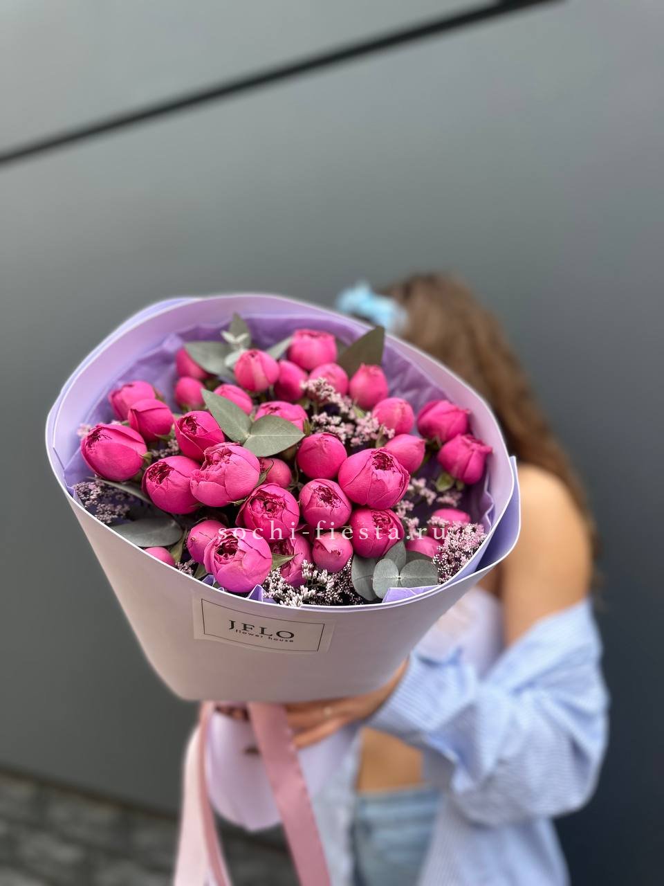25 пионовидные кустовые розы,  хлопок, лента, дизайнерская упаковка.