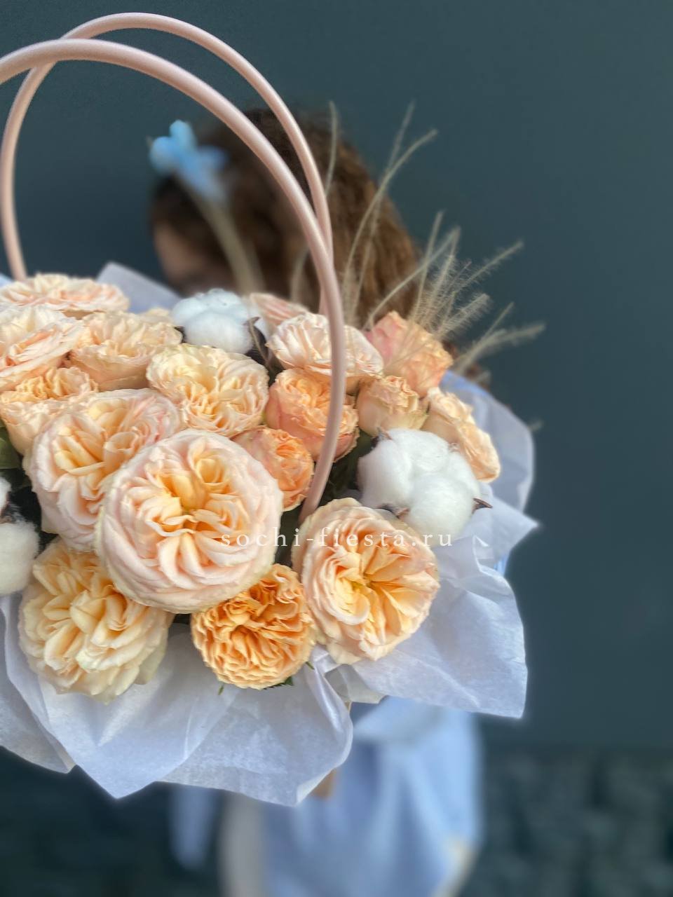 Кустовые розы сорта Джентл с пушистыми коробочками хлопка создают спокойную гармонию в компактной сумочке. Простая композиция для тех, кто любит естественность без лишних деталей.