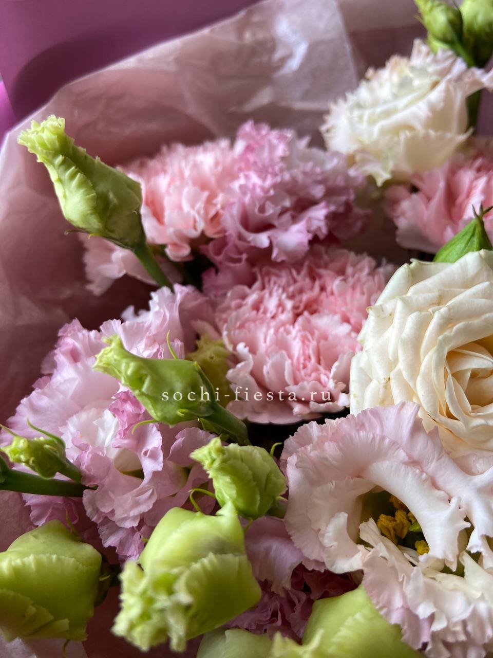 эустома, диантусы, кремовая кустовая роза или белые розы, авторское оформление.