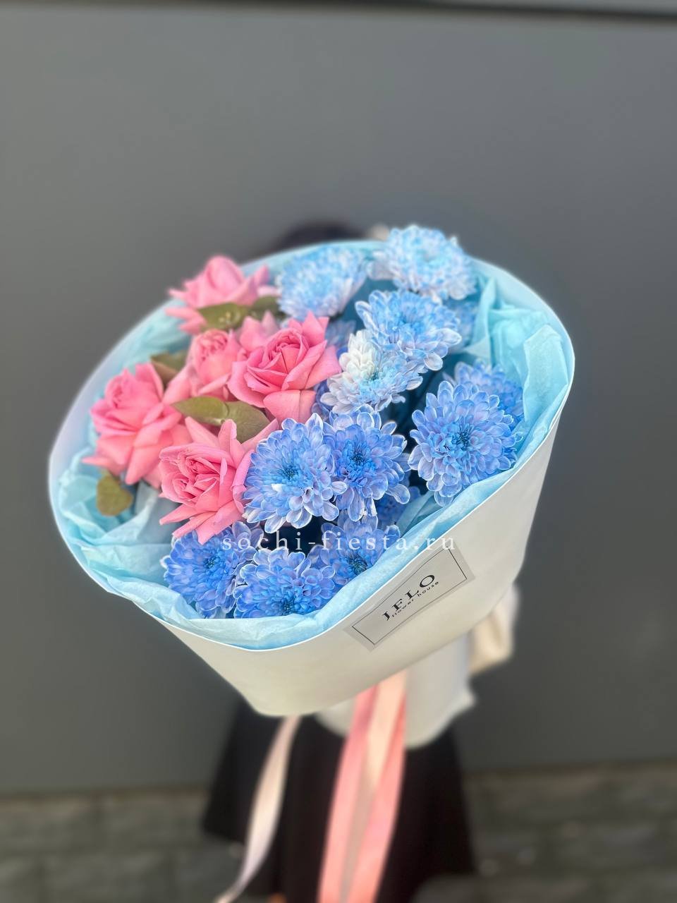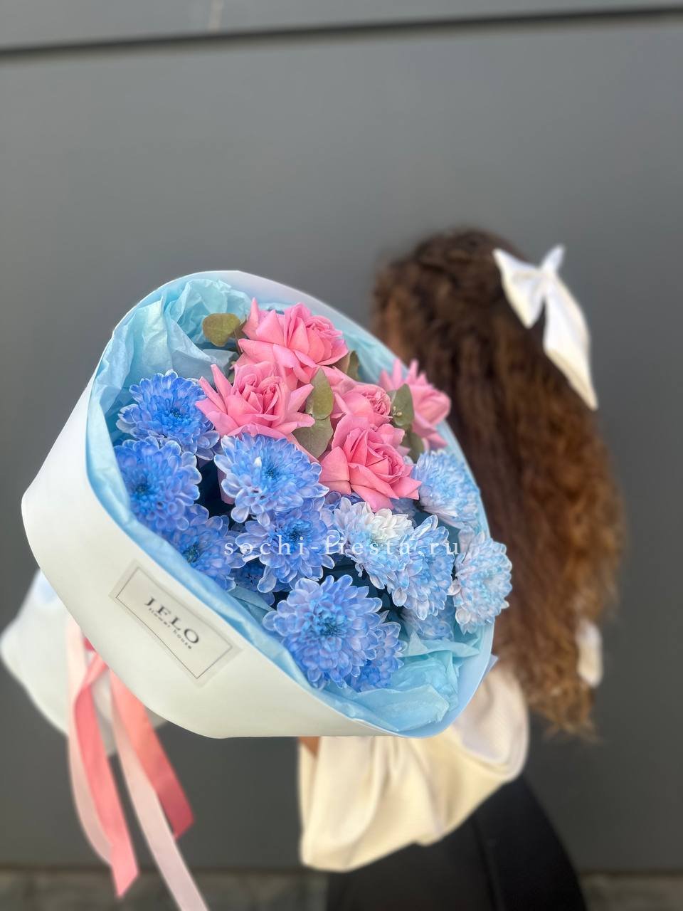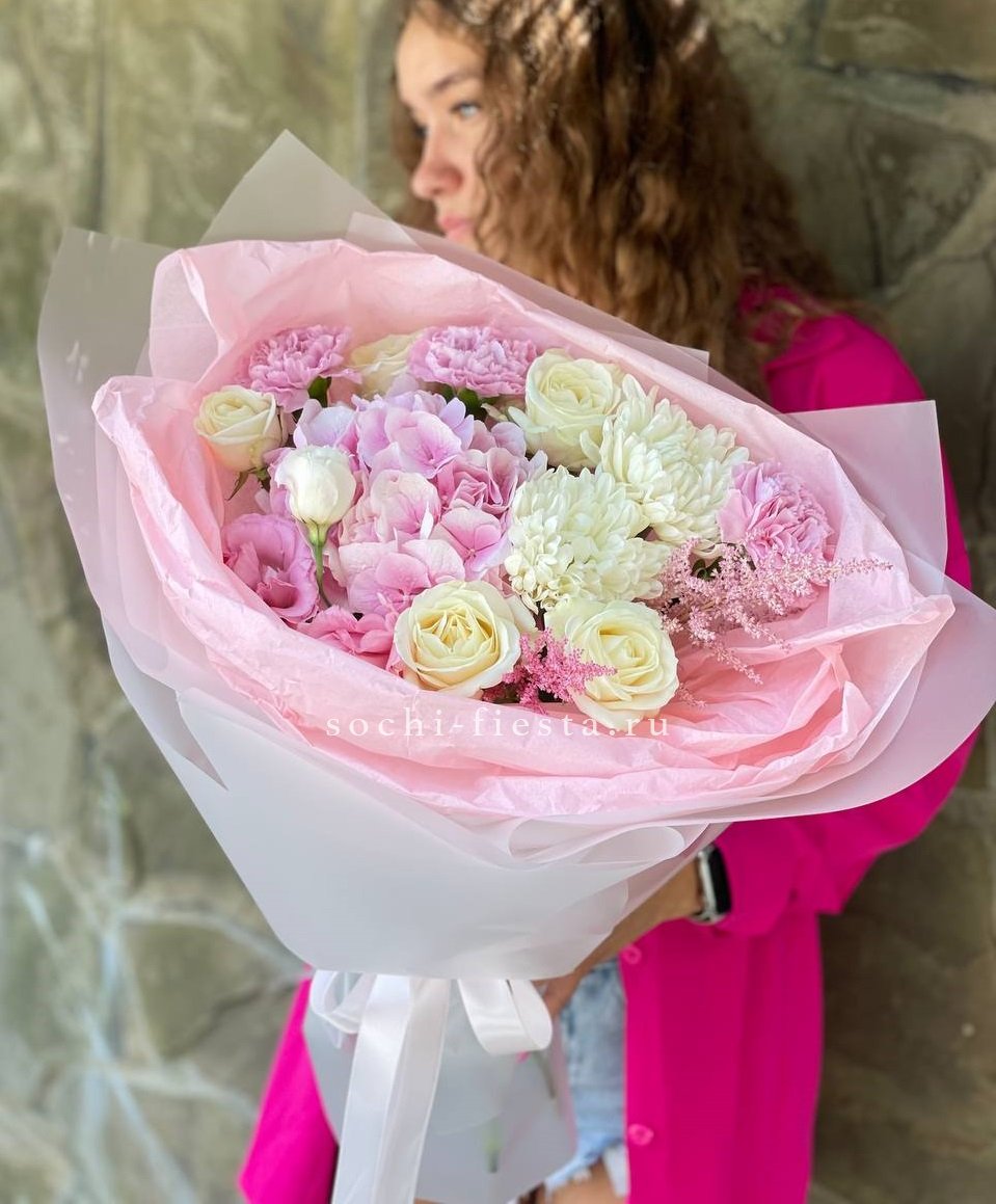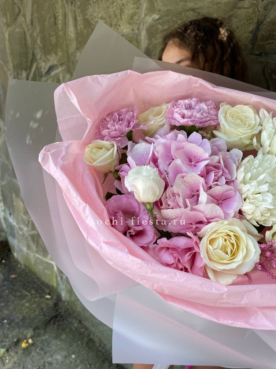 гортензия, герберы, эустомы, розы, диантус, эвкалипт, лента, дизайнерская упаковка.