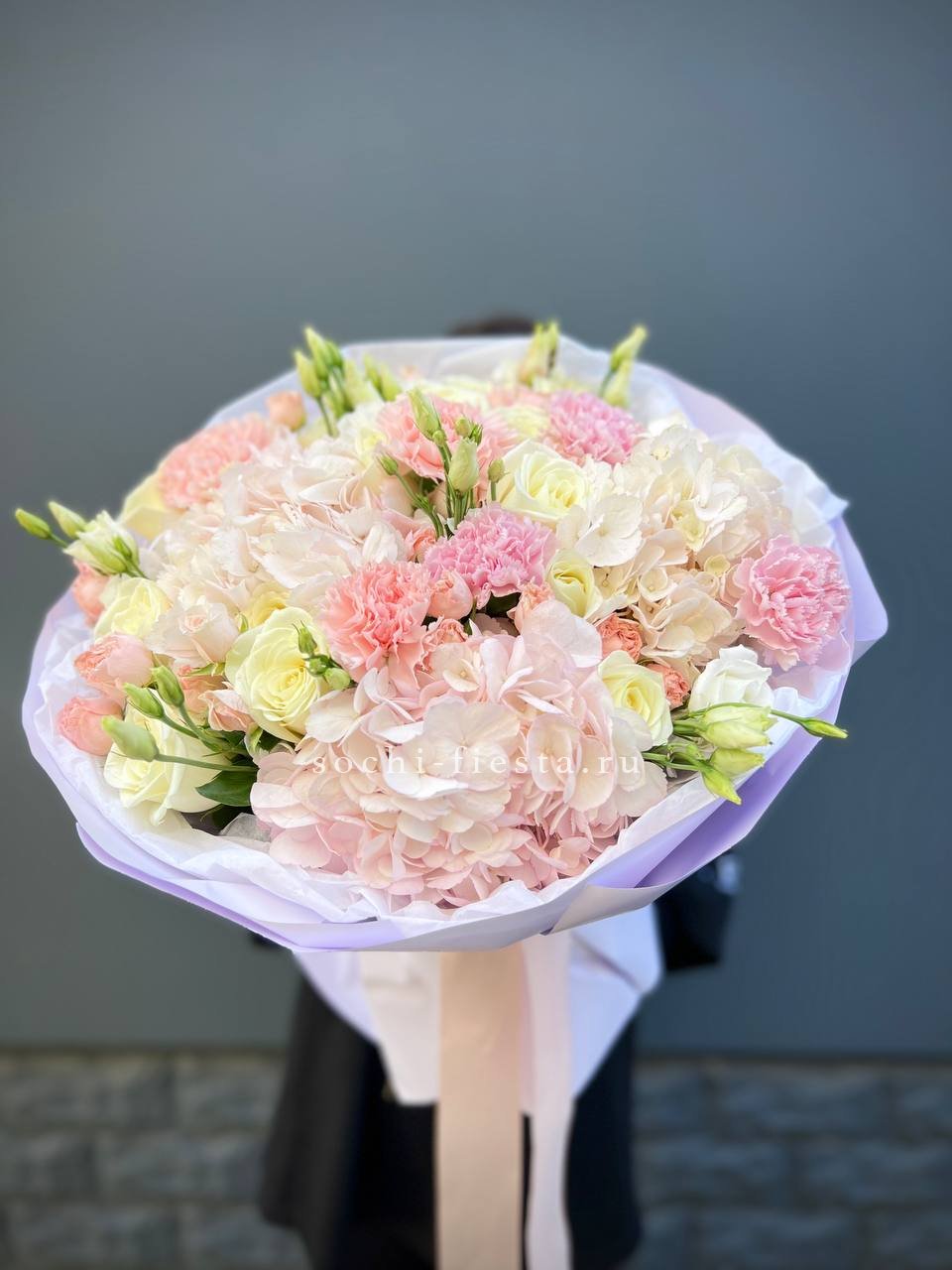 гортензия, розы джумилия, бомбастик, альстромерия, маттиола, чико, авторское оформление.