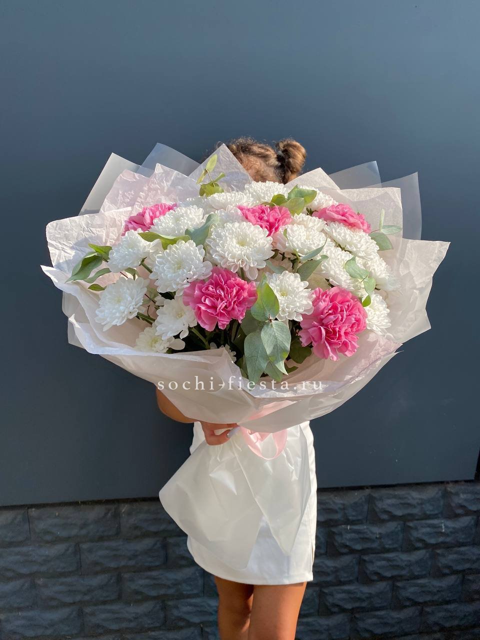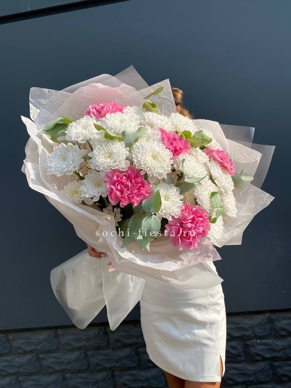 хризантема кустовая, белые розы, эвкалипт, лента, дизайнерская пленка.