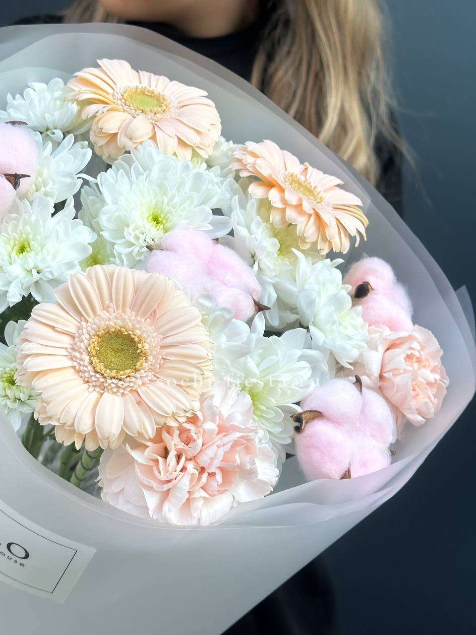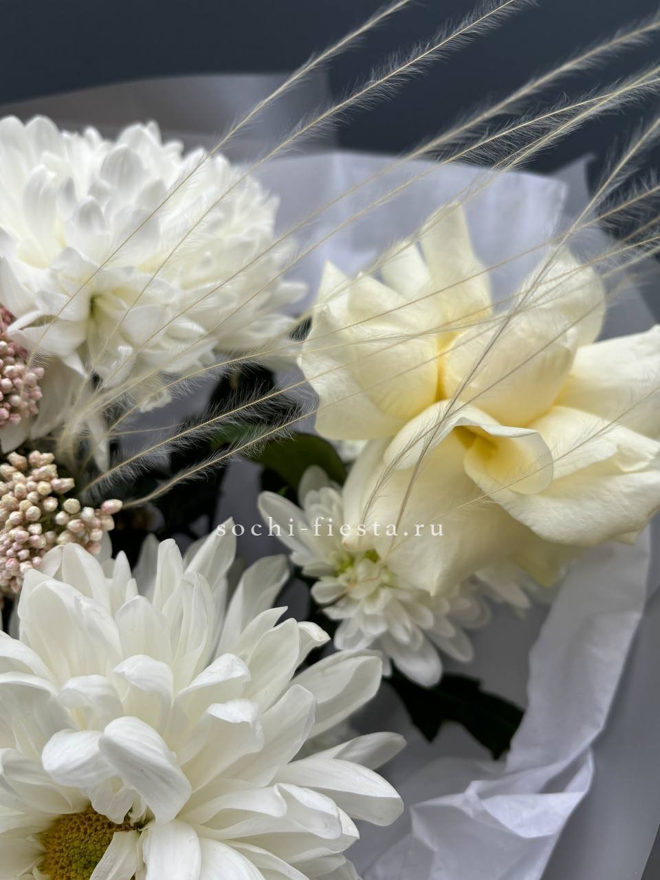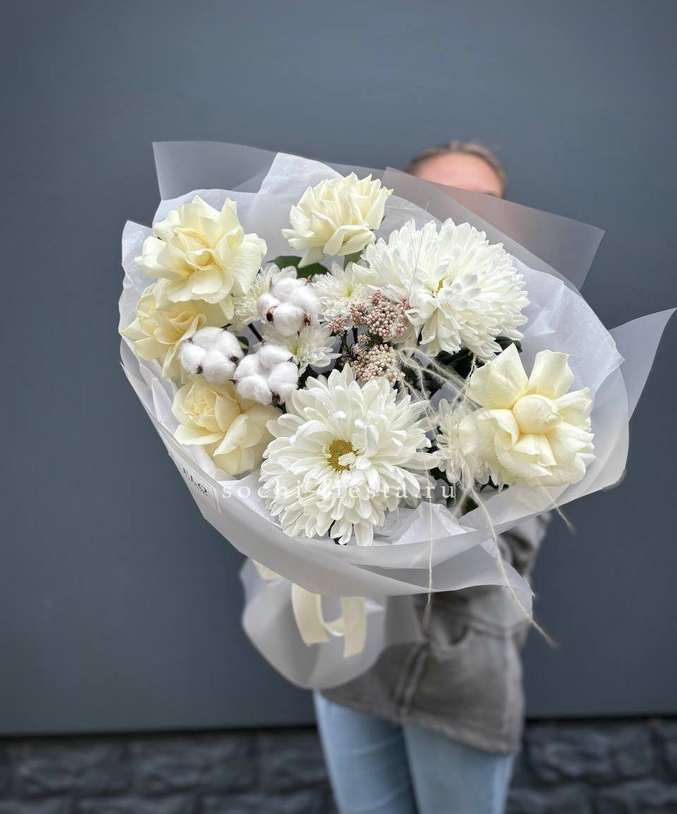 Белые французские розы переплетаются с пушистыми соцветиями маттиолы и хлопка. Гортензия и пионовидные бутоны создают объём, а ковыль вносит лёгкую небрежность в общий ритм.