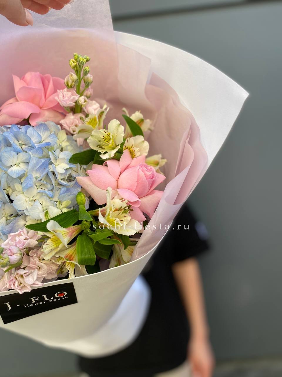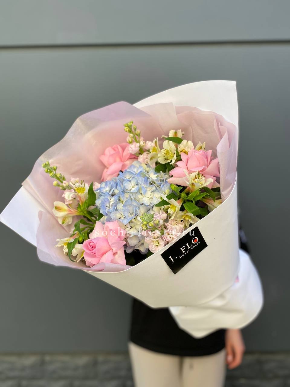 гортензия, французские (вывернутые) розы, лента, дизайнерская пленка, тишью.