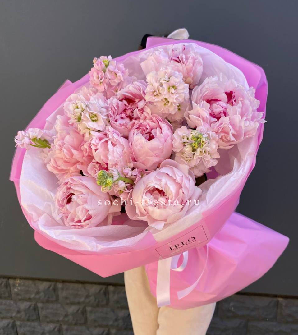 Пышные бутоны пионов с воздушной маттиолой собраны в композицию с мягкими линиями. Тишью и лента завершают образ, добавляя лёгкости и объёма.