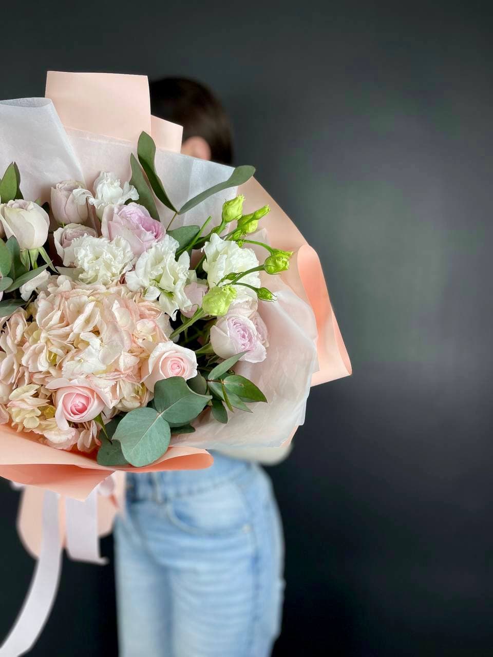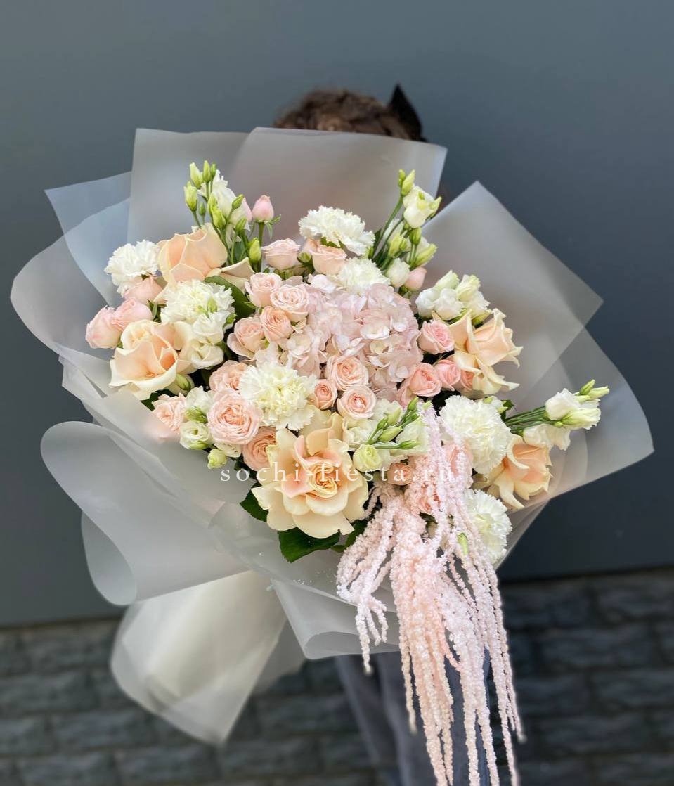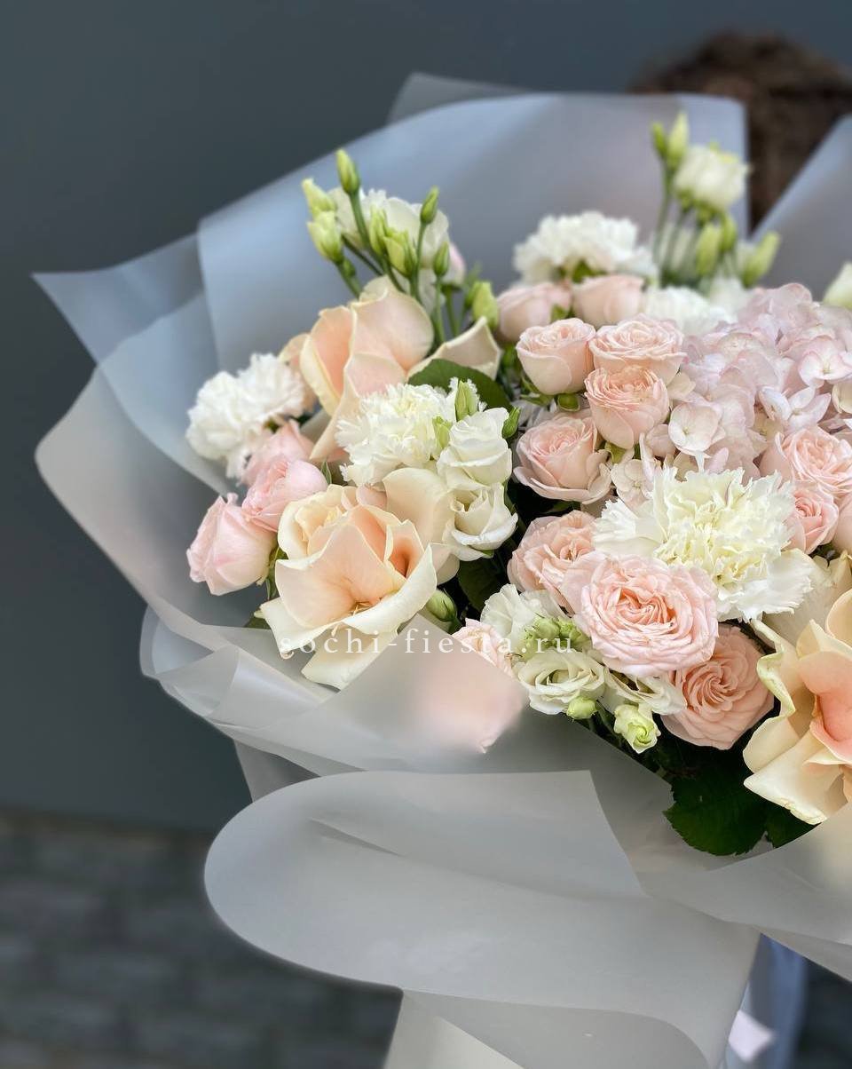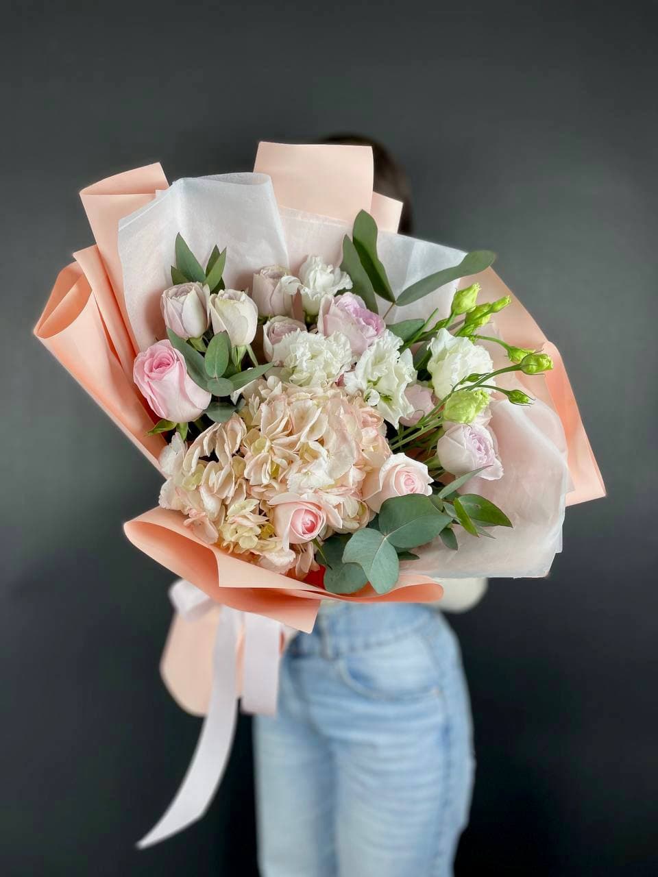 гортензия, диантус, хризантема, эустома, розы, озатамус, пленка.