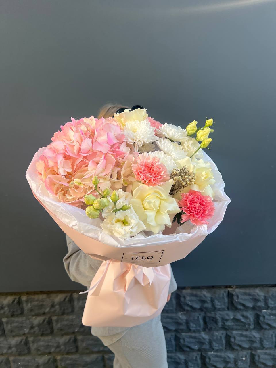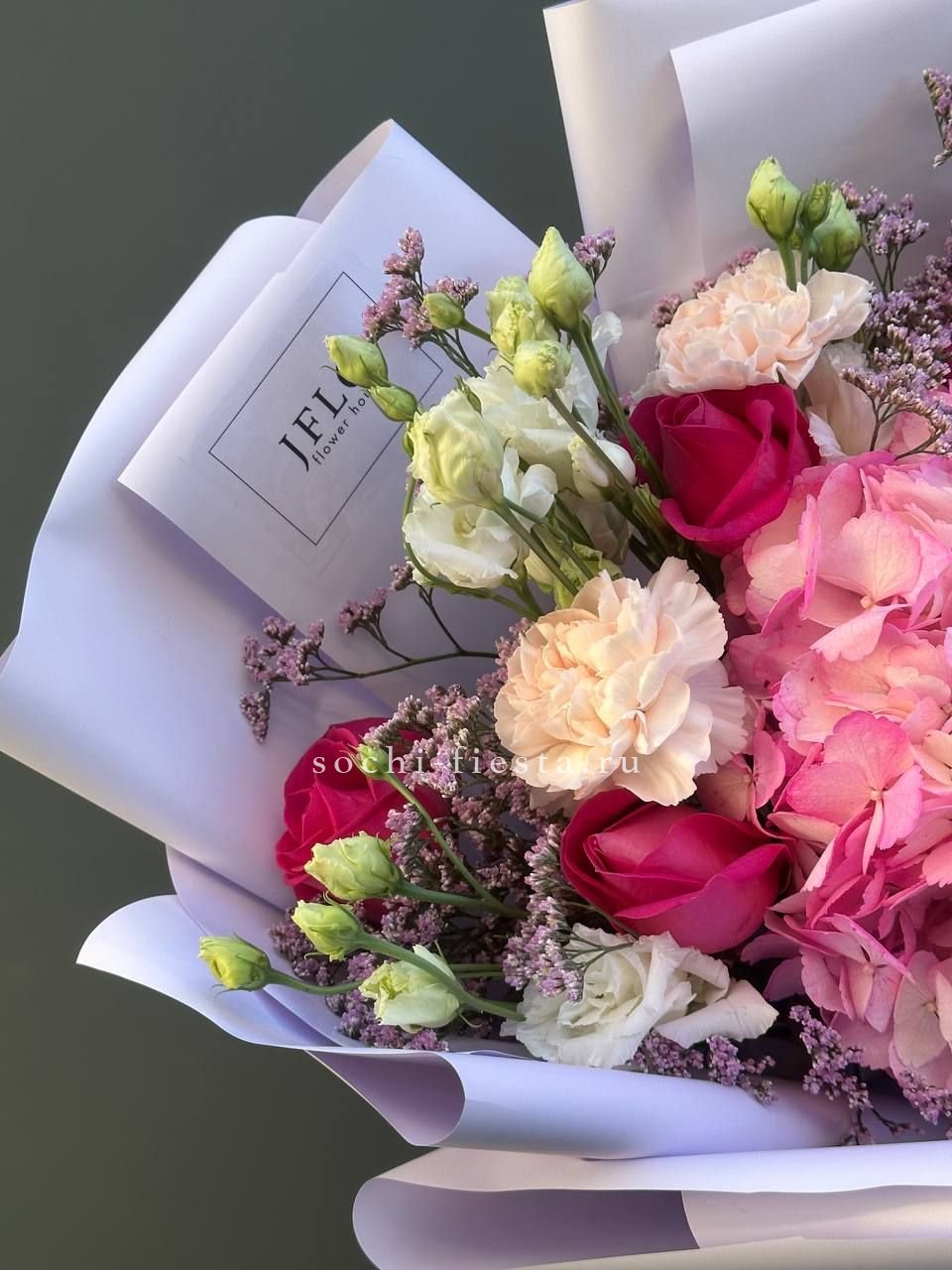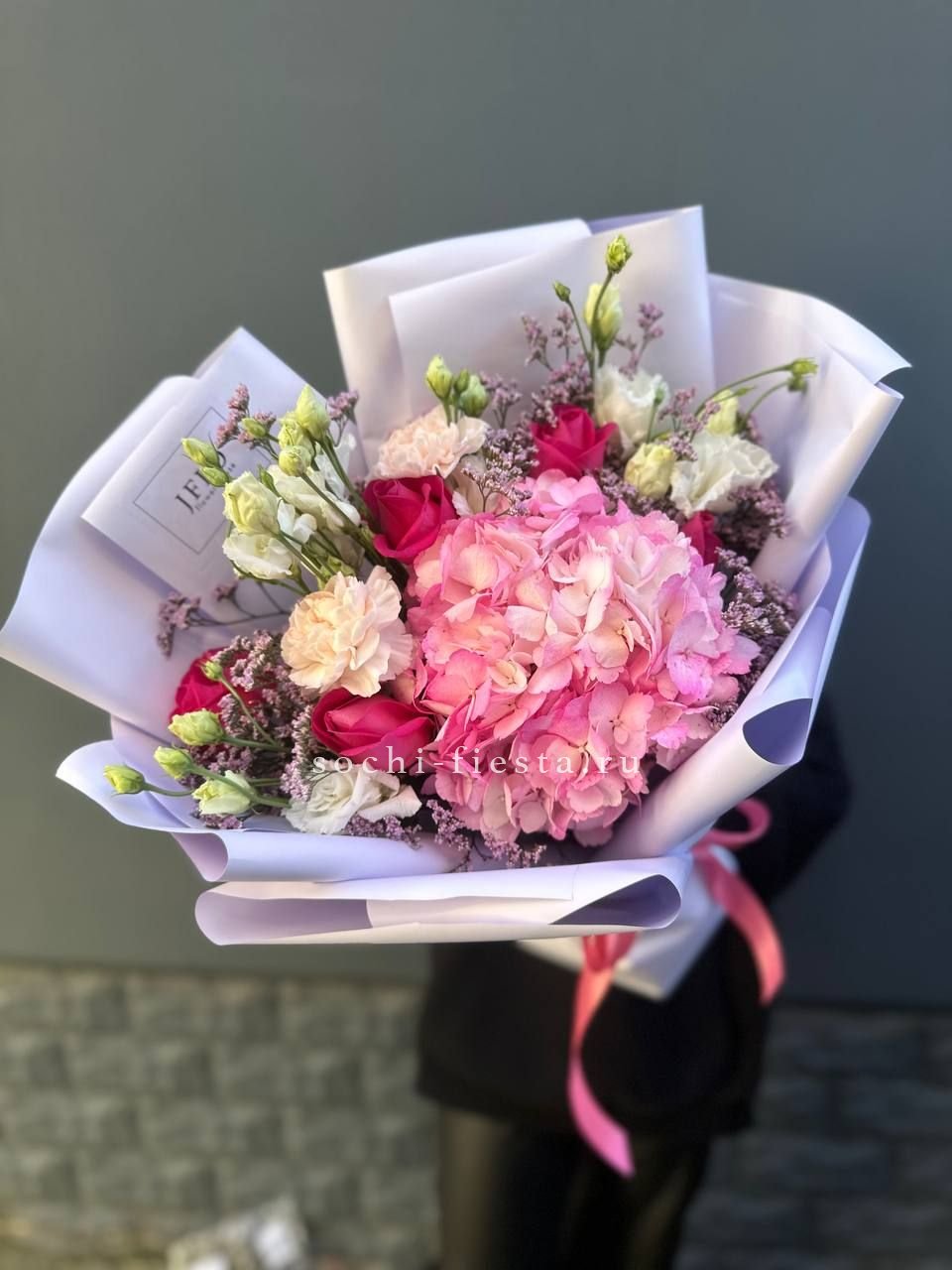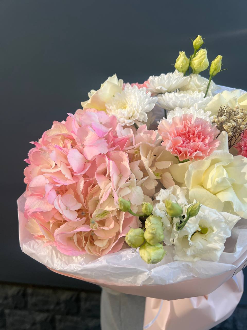 гортензия, белая роза, диантус, хризантема, эустома, озатамус, пленка.