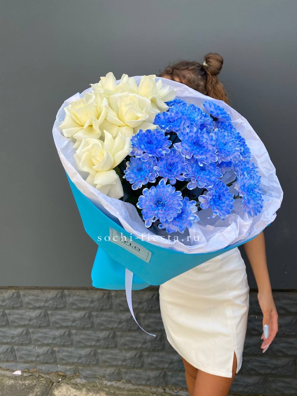 Белые розы и кустовая хризантема собраны в лаконичную форму. Светлая палитра и чистые линии букета подходят для любого повода и интерьера.