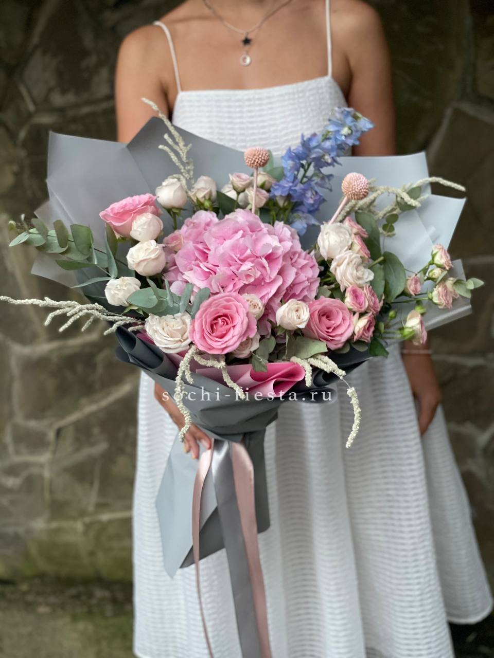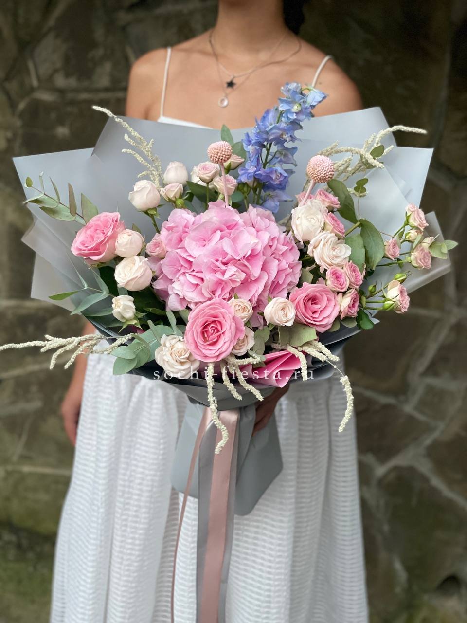 гортензия, пионовидная роза, озотамус, белая роза в нежном оформлении.
