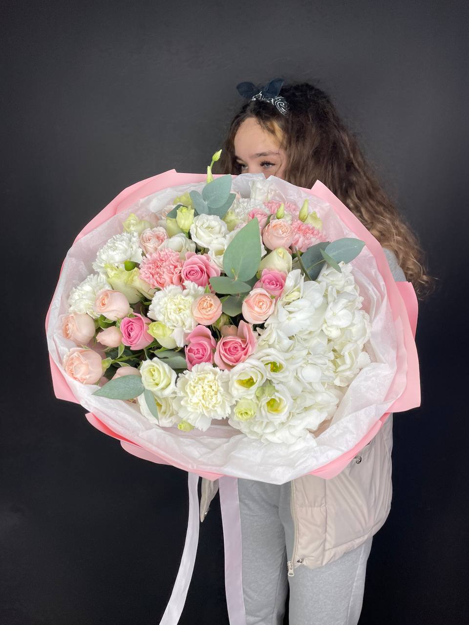 джумилия, диантус, озатамус, гербера, гортензия, пленка.