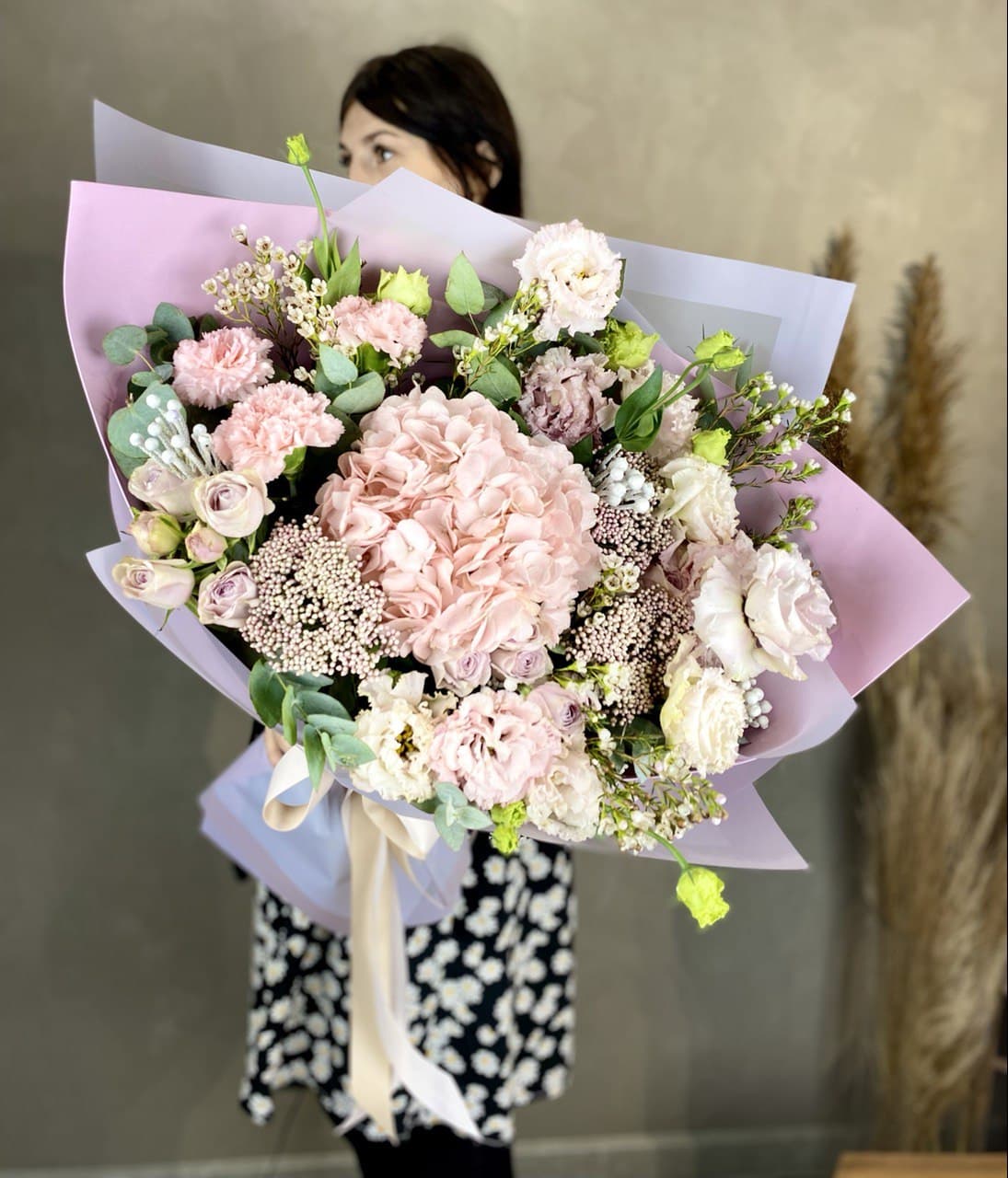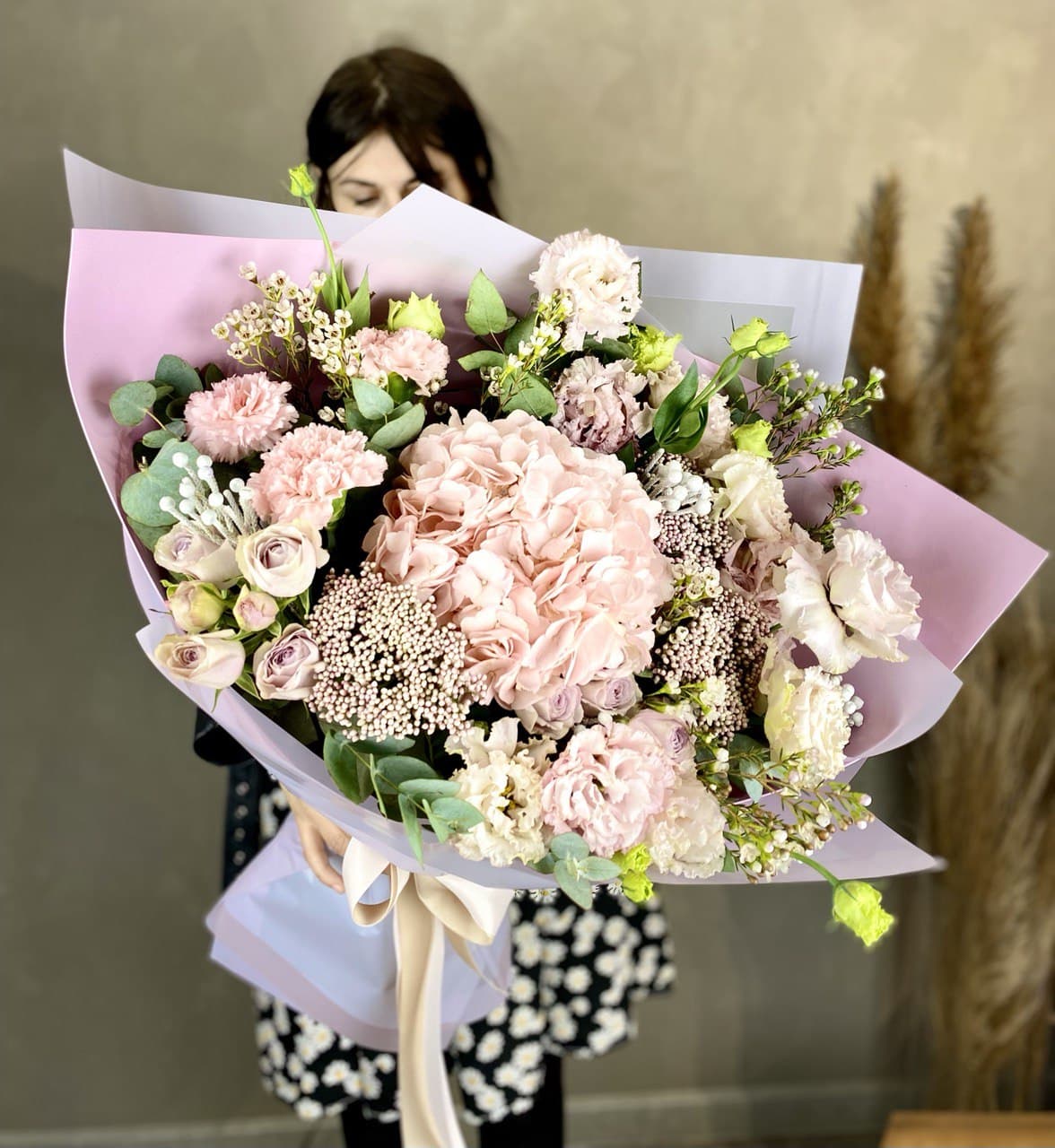 Воздушная гортензия окружена розовыми бутонами и душистой маттиолой. Лимониум добавляет букету лёгкую дымку, а общий силуэт остаётся мягким и собранным.