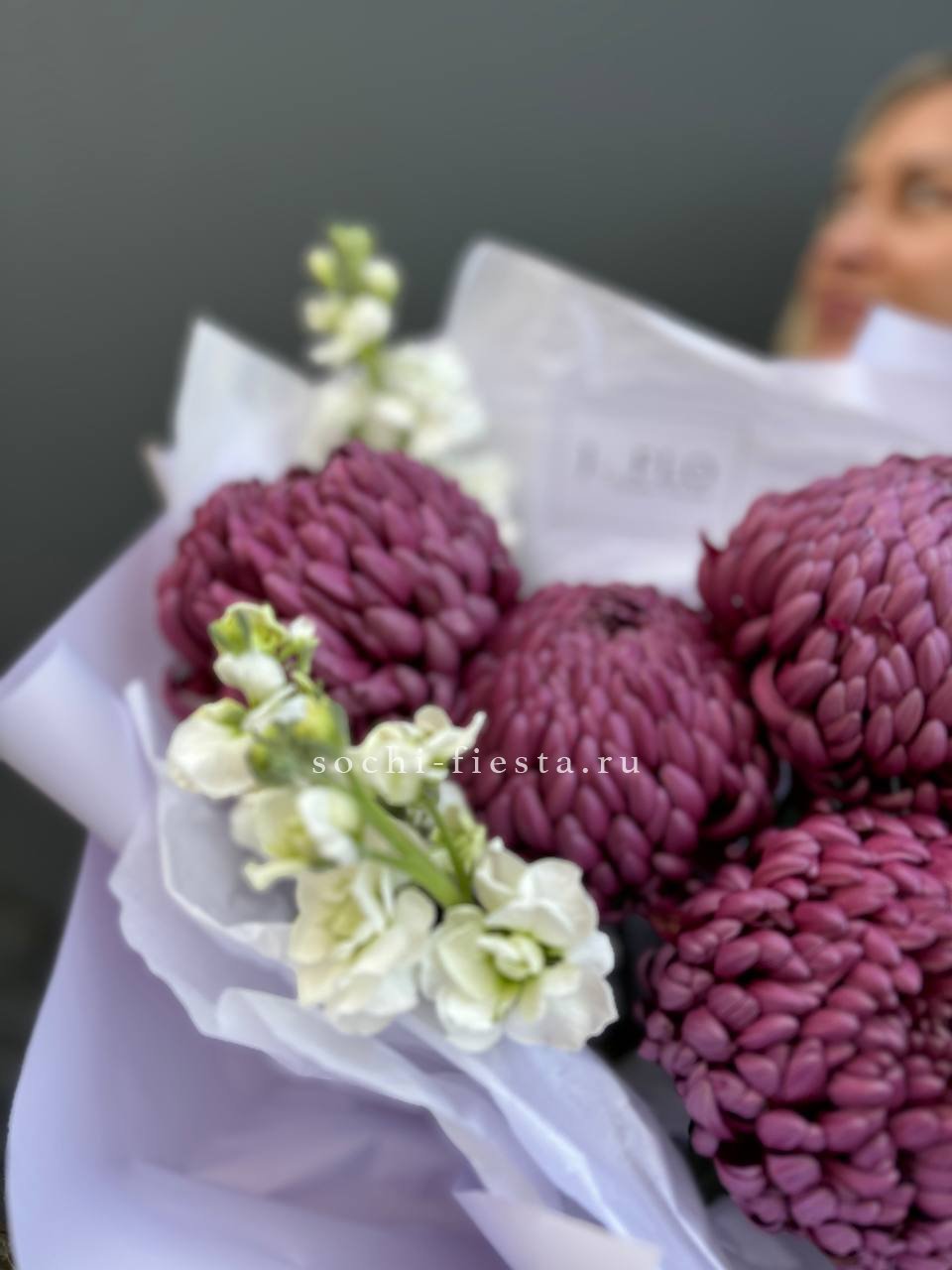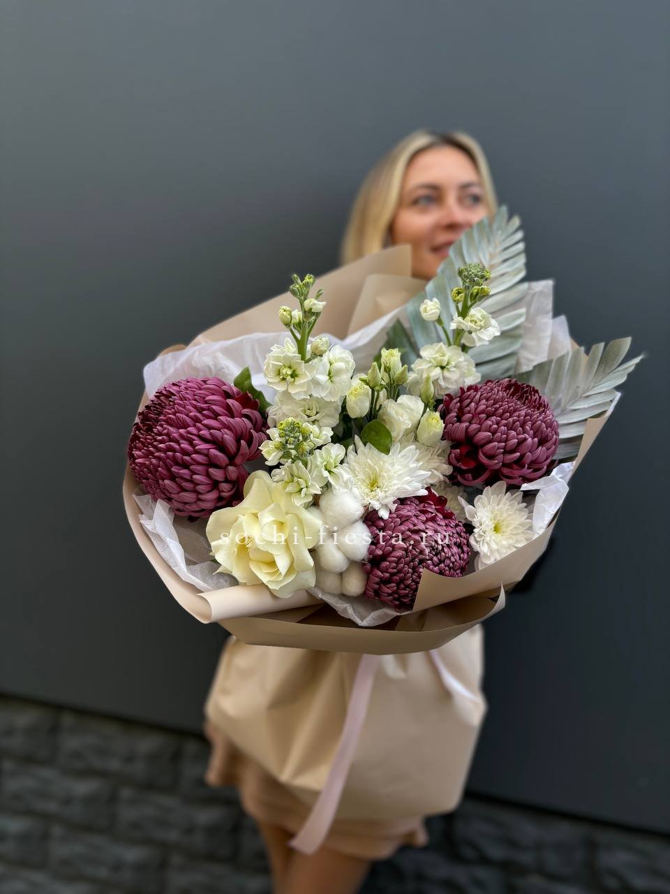 хризантемы Бигуди, маттиола, лист чика (возможна замена на эвкалипт), хризантема кустовая,  эустома, хлопок, лента, дизайнерская упаковка.