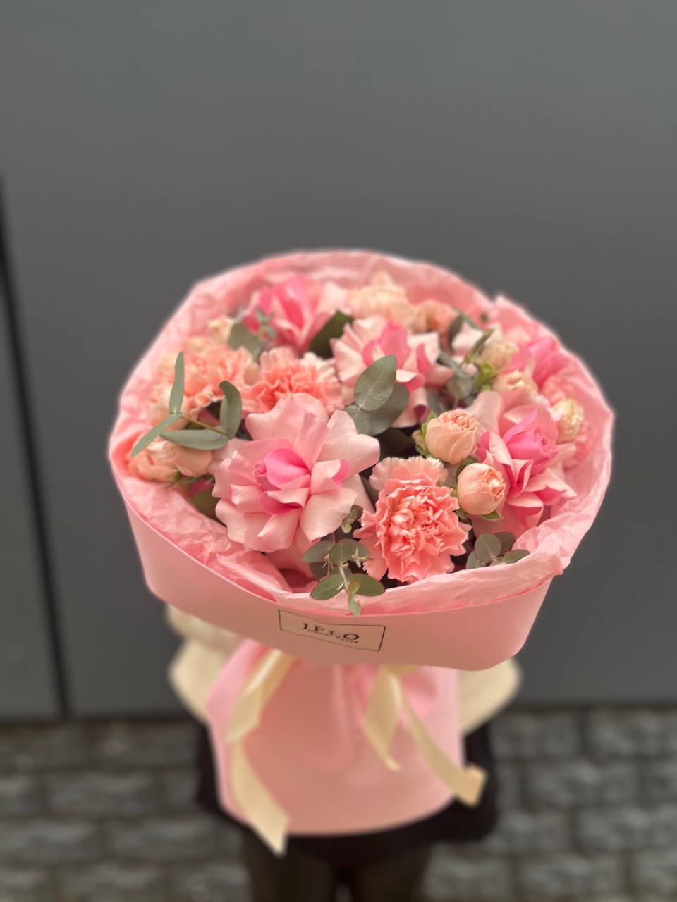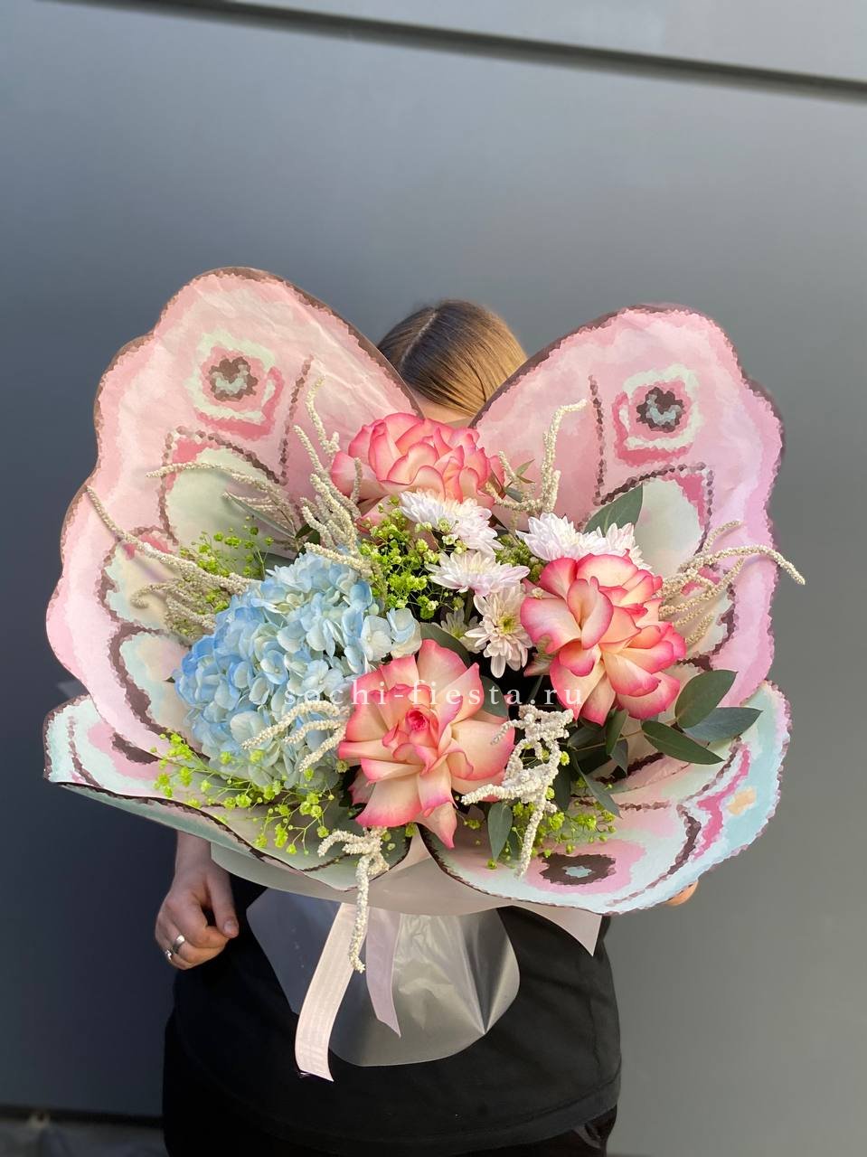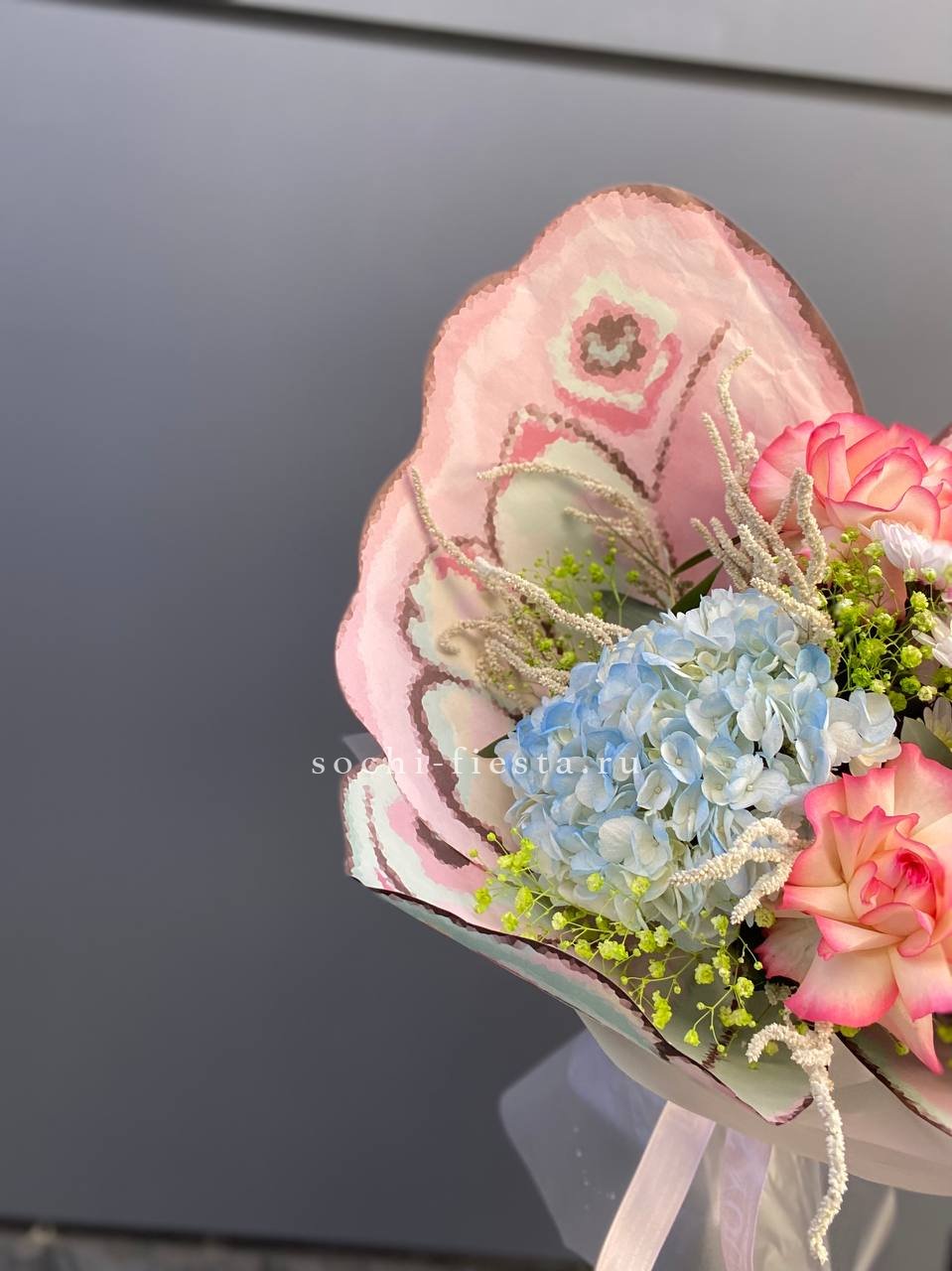 гортензия, гербера, диантус, эустома, свит ревиваль, кустовая роза, эвкалипт, лента, корейская пленка.