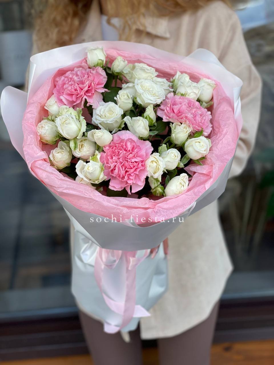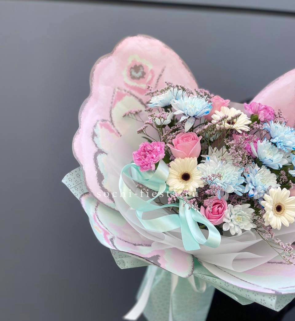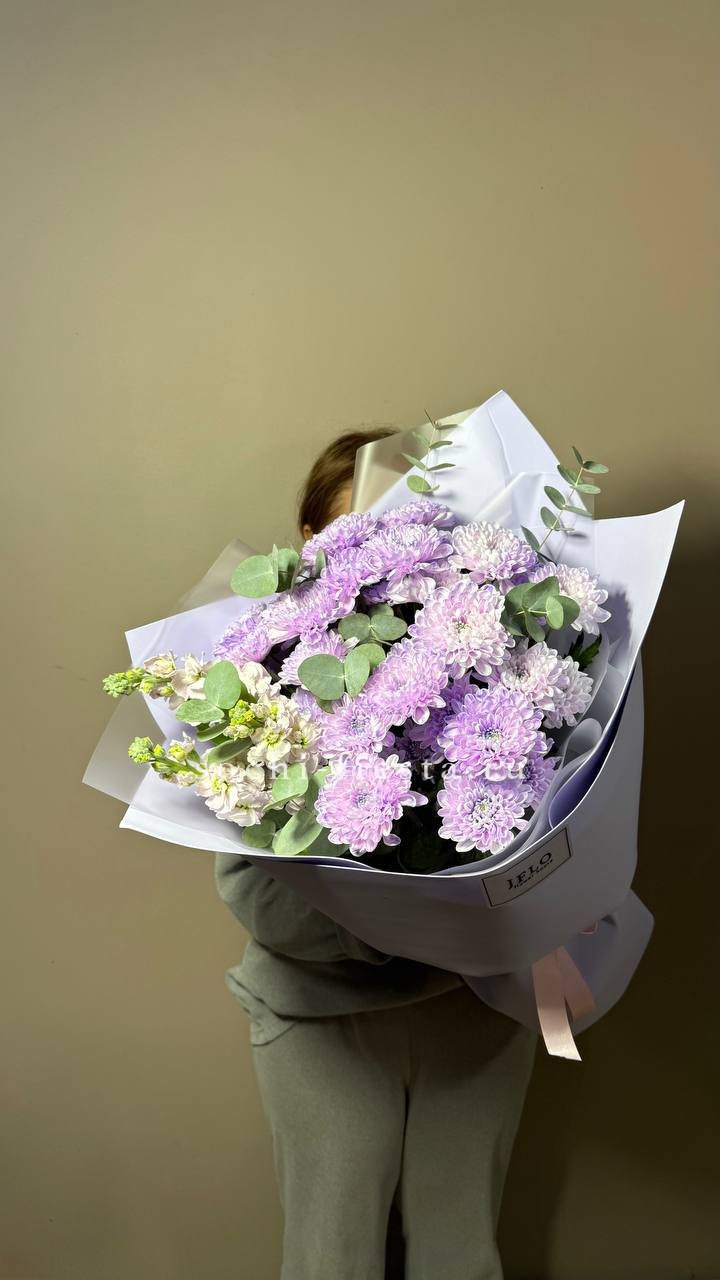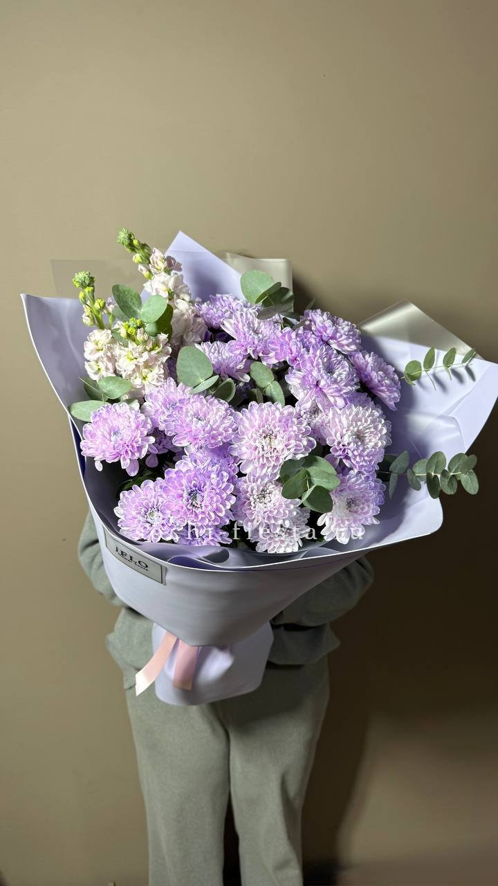 Букет объединяет хризантемы, диантусы, розы, эустому и гортензию в плотную композицию. Корейская пленка удерживает форму и создает графичный силуэт с четкими границами.