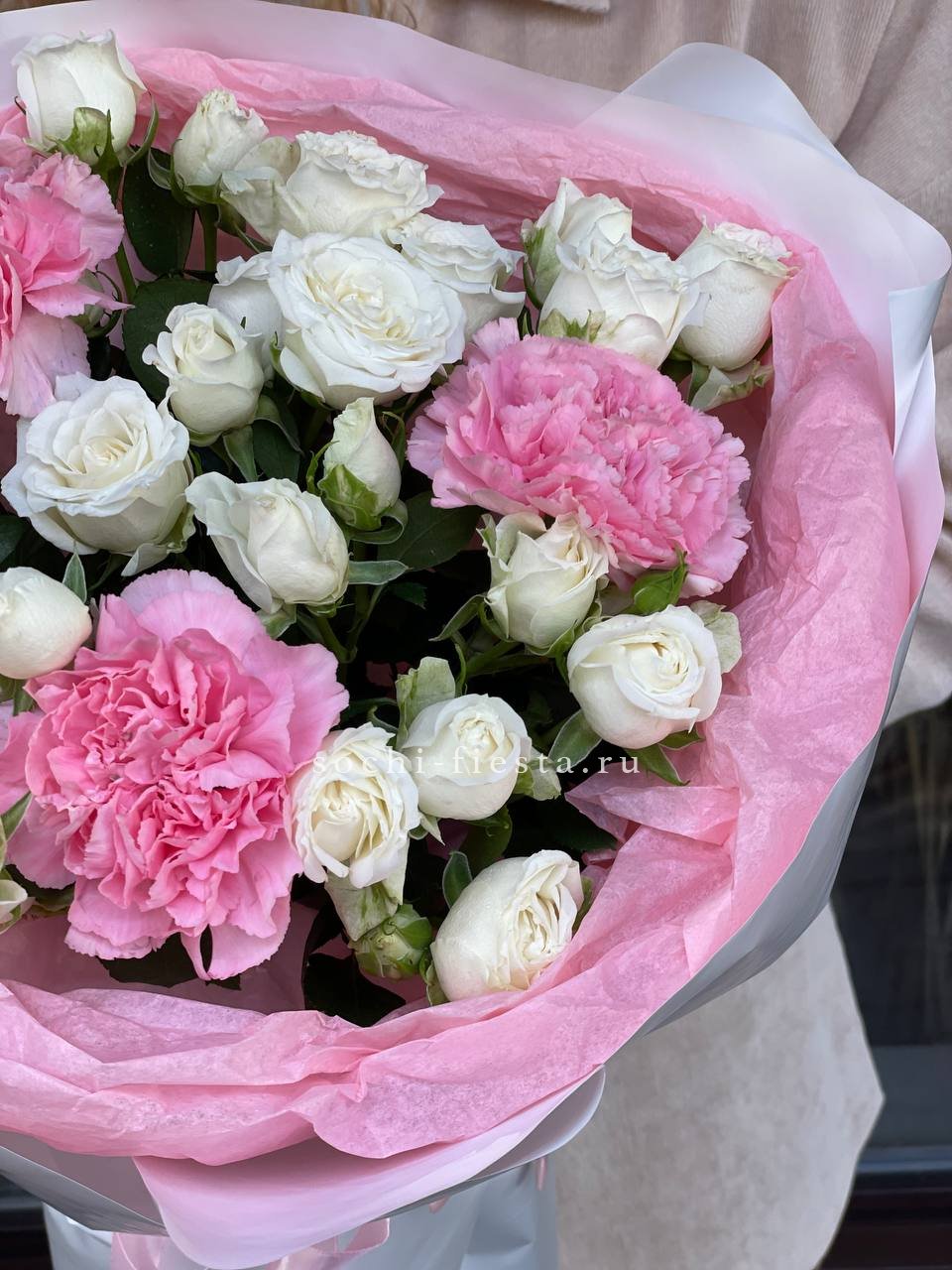 хризантемы, диантусы, розы, эустома, гортензия, лента, корейская пленка.