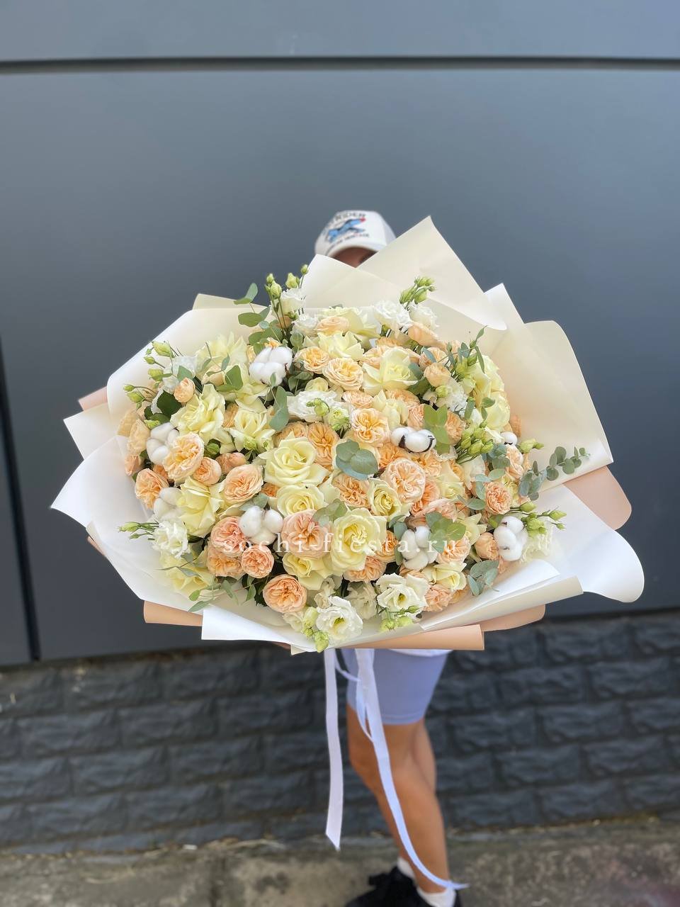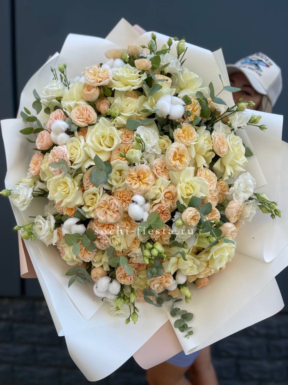 Белоснежная палитра с эустомой и пионовидными розами дополнена натуральным хлопком и эвкалиптом. Крупная композиция с выразительным присутствием и продуманной архитектурой. Форма держится долго благодаря плотности сборки.