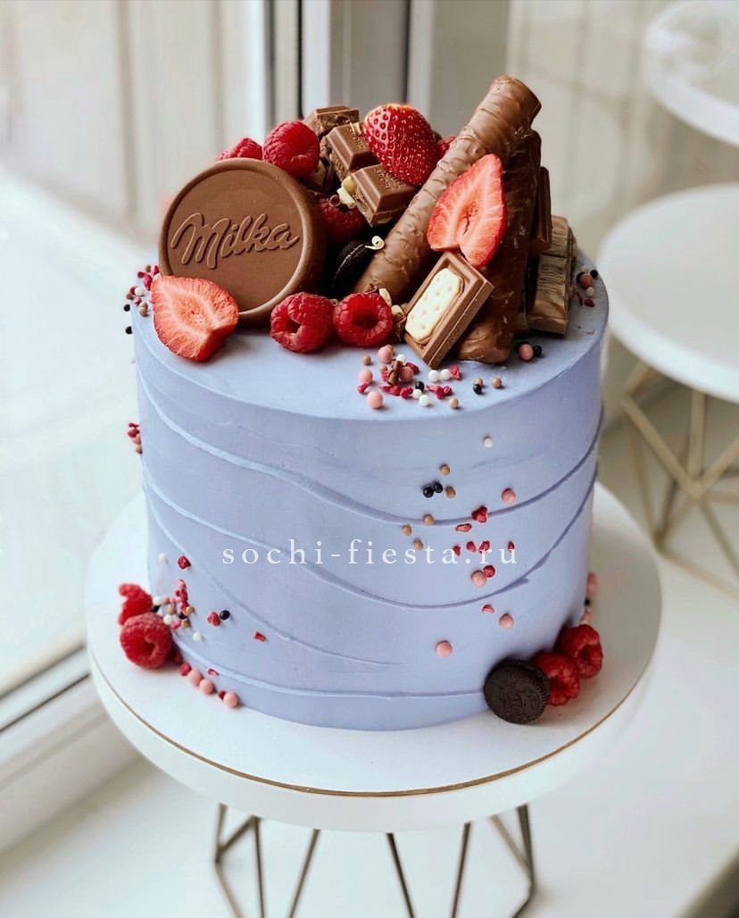 Сиреневый крем с россыпью шоколадных драже и волнистыми деталями создает игривое настроение. Два яруса с плавными линиями и яркими акцентами. Ручная работа с выбором вкуса.